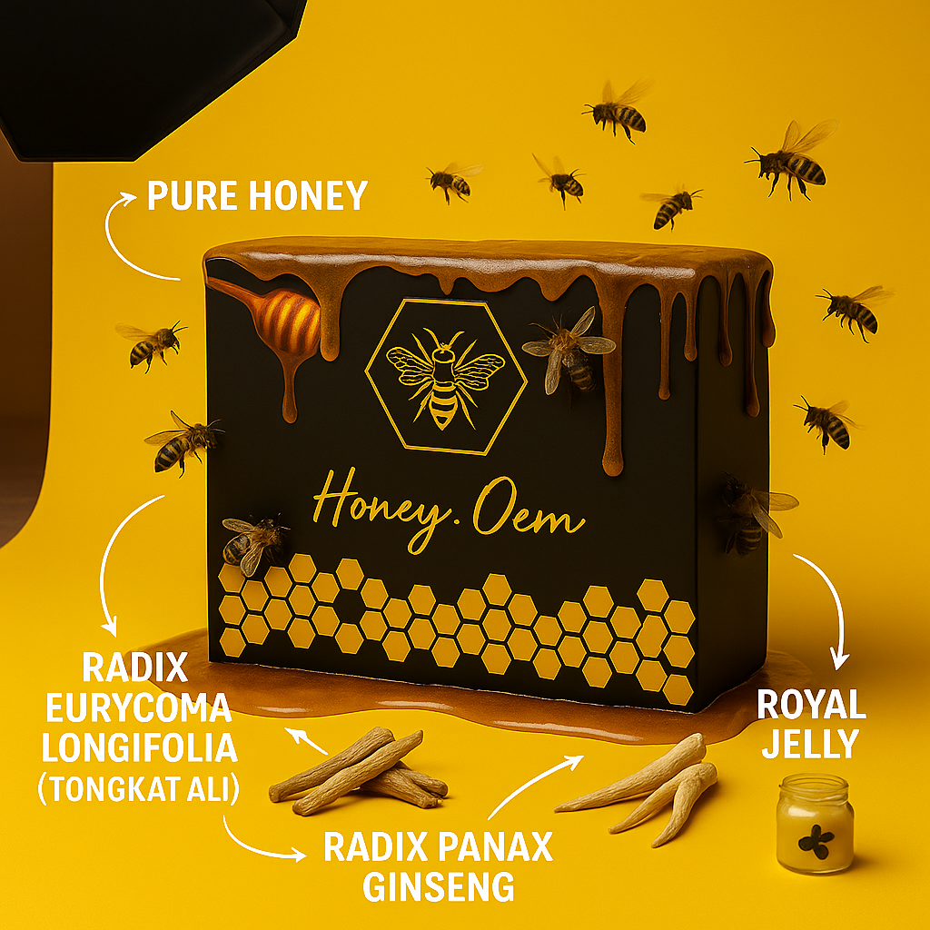 Each satchet contains : 93% Pure Honey, Radix Eurycoma Longifolia 3% (also known as Tongkat Ali), Radix Panax Ginseng 2%, and 2% Royal Jelly.
